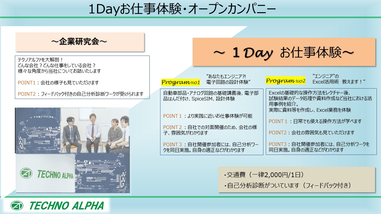 まずはテクノアルファがどんな会社か知っていただければと思いますので、お気軽にご参加ください!